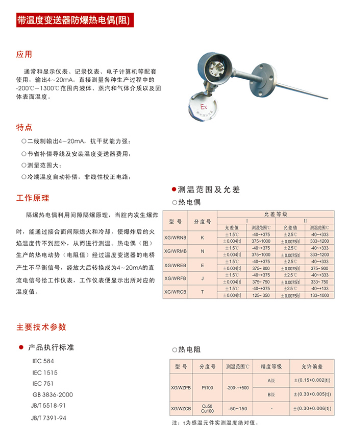 帶溫度變送器防爆熱電偶(阻),通常和顯示儀表、記錄儀表、電子計算機等配套使用,輸出4~20mA,直接測量各種生產過程中的-200℃-1300℃范圍內液體、蒸汽和氣體介質以及固體表面溫度。