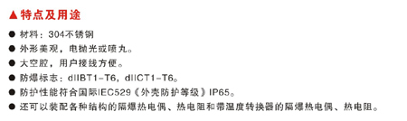 ●還可以裝配各種結構的隔爆熱電偶、熱電阻和帶溫度轉換器的隔爆熱電偶、熱電阻。