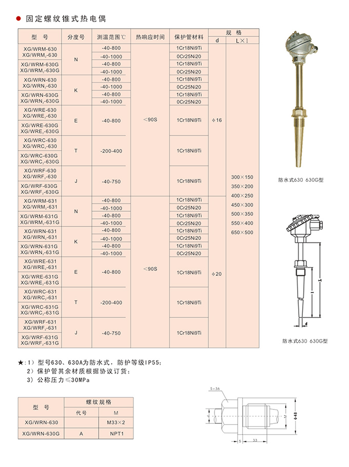 固定螺紋錐形裝配熱電偶作為一種溫度傳感器,通常和顯示儀表,記錄儀表和電子調(diào)節(jié)器配套使用。可以直接測(cè)量各種生產(chǎn)中從0℃到1300℃范圍的液體蒸汽和氣體介質(zhì)以及固體的表面溫度。熱電偶通常由感溫元件、安裝