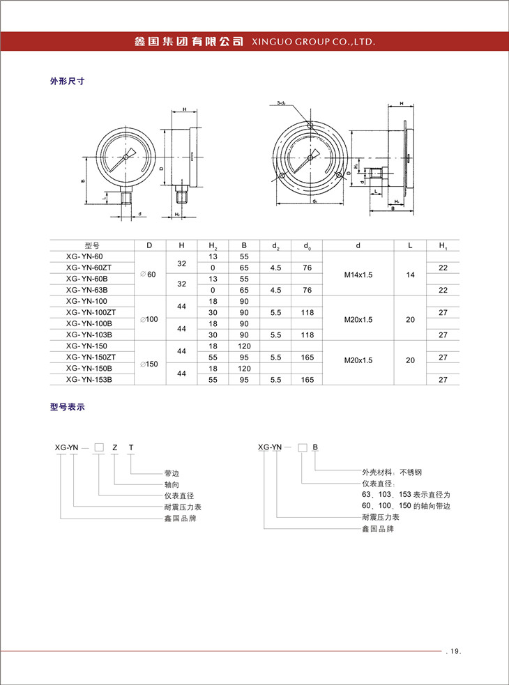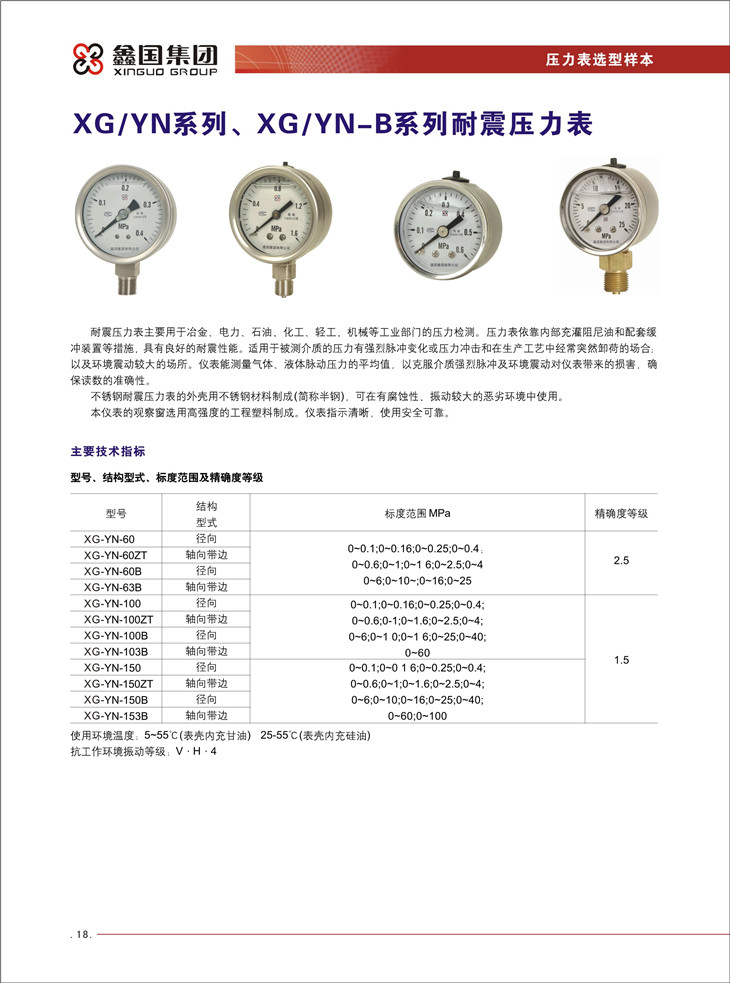 XG/YN系列、XG/YN-B系列耐震壓力表:
