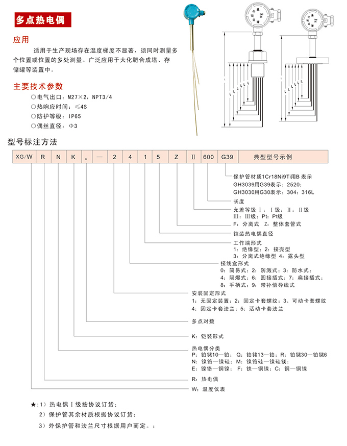 多點(diǎn)熱電偶,適用于生產(chǎn)現(xiàn)場(chǎng)存在溫度梯度不顯著,須同時(shí)測(cè)量多個(gè)位置或位置的多處測(cè)量。多點(diǎn)熱電偶廣泛應(yīng)用于大化肥合成塔、存儲(chǔ)罐等裝置中。