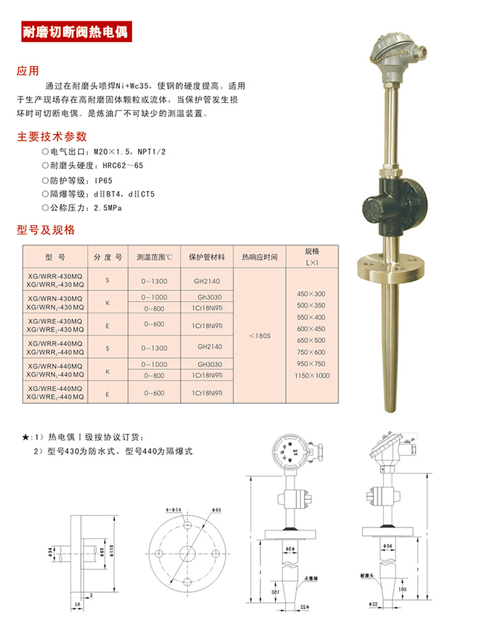 耐磨切斷閥熱電偶,通過在耐磨頭噴焊 Ni +Wc35,使鋼的硬度提高。耐磨切斷閥熱電偶適用于生產(chǎn)現(xiàn)場(chǎng)存在高耐磨固體顆粒或流體,當(dāng)保護(hù)管發(fā)生損壞時(shí)可切斷電源,是煉油廠不可缺少的測(cè)溫裝置。