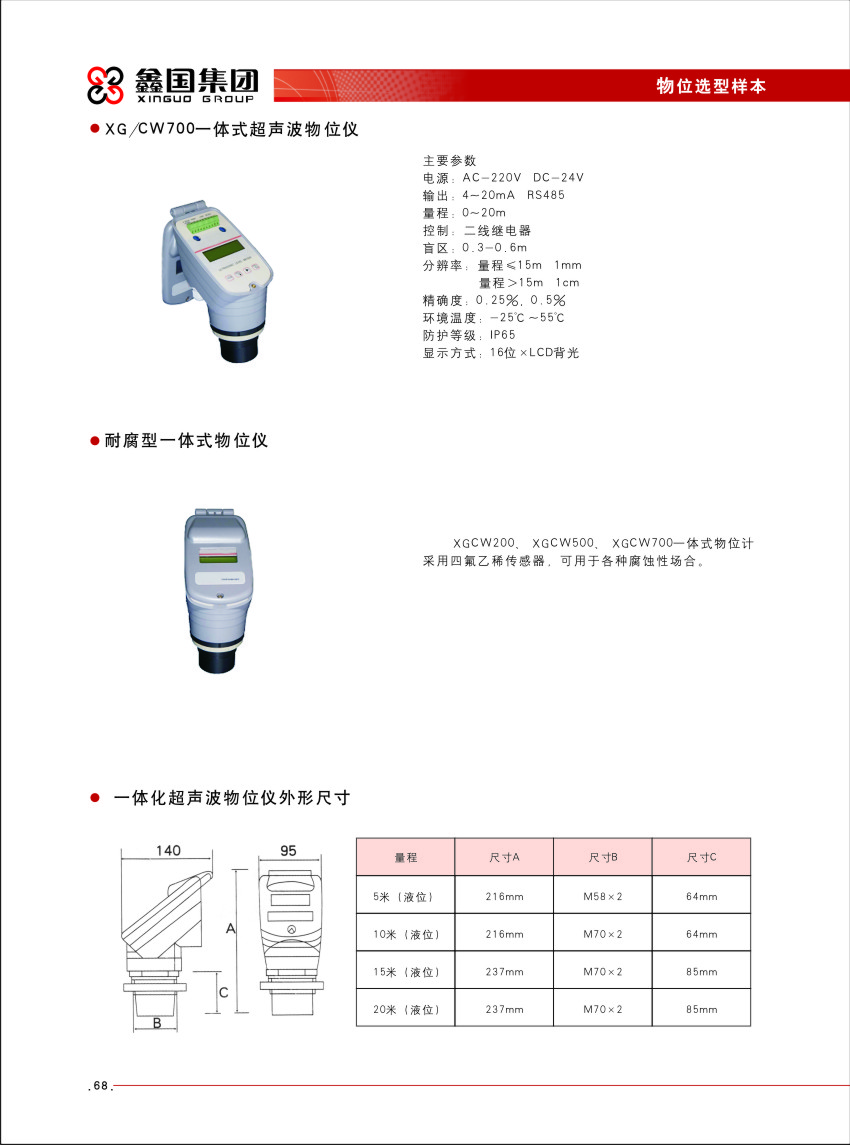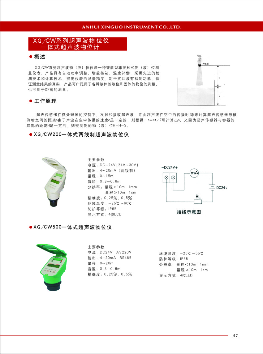 XG/CW 系列超聲波物位儀,一體式超聲波物位計。 XGCW 系列超聲波物(液)位儀是一種智能型非接觸式物(液)位測量儀表,產品具有自動功率調整,增益控制,溫度補償,采用先進的檢 測技術和計算技術,