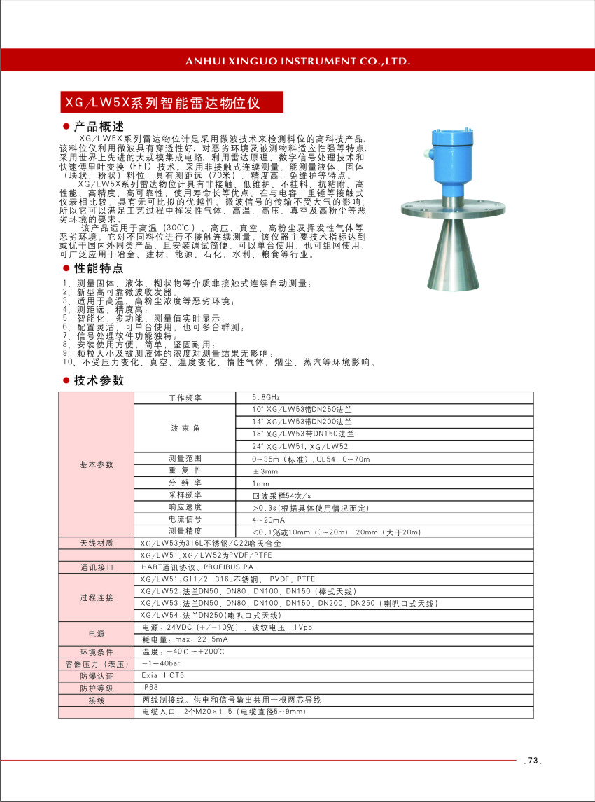 智能雷達物位儀, XG /LW5X系列雷達物位計是采用微波技術來檢 測料位的高科技產品,該物位儀利用微波具有穿透性好,對惡劣環境及被測物料適應性強等特點,采用世 界上先進的大規模集成電路,利用雷達原理,數字信號處理技術和快速傅里葉變換(FFT)技術。采用非接觸式連續測量,能測量液體、固體(塊狀、粉狀)料位,具有測距遠(70米),精度高,免維護等特點。